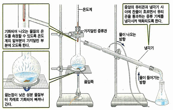 그러므로, 증류를 할 때 온도가 일정하게 유지되는 동안에 증류되어 나오는 부분만을 모은다. 이와 같이 용액을 끓일 때 나오는 증기를 끓는점에 따라 물질을 분리하는 방법을 분별 증류라 한다.