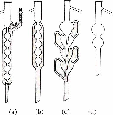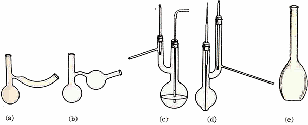 (a) 안쉬쯔 플라스크 (b) 무엔케 플라스크 (c) 클라이젠 플라스크 (e)후우벤 플라스크