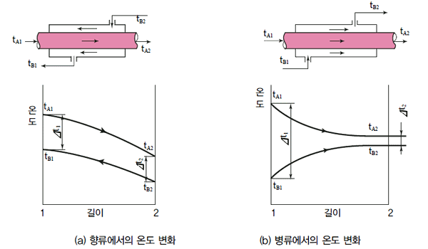 그림 Ⅲ-15 병류와 향류에서의 온도 변화