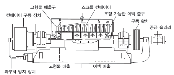 - 수평축형 경사 분리기(decanter)가 많이 쓰이며, 샤플레스형, 드래블형은 고형분이 많은 현탁액의 처리에는 적합하지 않지만 원심 경사 분리기(decanter)는 다량의 고형물을 포함한 현탁액의 처리에 알맞다. 원심 효과는 500~2,000 정도이다.