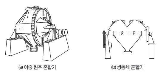 - 단순히 통을 회전시키거나 고정 교반 날개를 설치하여 회분식으로 시멘트 몰탈의 혼합 등에 사용하며 유동성 분체를 혼합하는 이중 원추 혼합기와 쌍동체 혼합기가 있다.