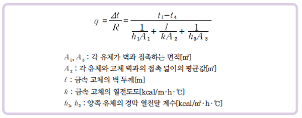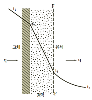 고체 벽과 유체 간의 열전달은 열이 이 경막을 통하여 일어나므로 이것도 하나의 벽으로 보고 열전달 속도식을 다음과 같이 나타낼 수 있다.