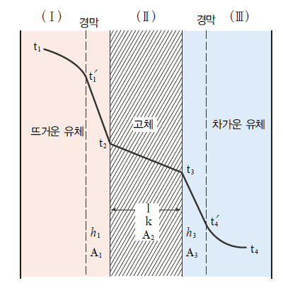 경막(Ⅰ), 고체 벽(Ⅱ), 경막(Ⅲ)에서 일어나는 열전달 속도는 다음과 같이 나타낼 수 있다.