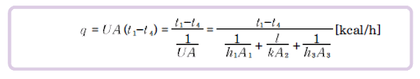 그림 Ⅲ-5에서 열전달량이 양쪽 유체의 온도차(t1-t4)와 평균 접촉 넓이(A)에 비례한다고 하면 총괄 열전달 계수(U, kcal/㎡·h·℃)를 사용하여 다음과 같이 나타낼 수 있다.
