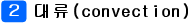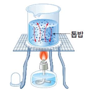 그림 2와 같이 물속에 톱밥을 넣고 가열하면 데워진 물은 위로 올라가고 찬물은 아래로 내려오는 것을 관찰할 수 있다. 액체나 기체가 열을 받게 되면 부피가 팽창하면서 주위와 밀도 차이가 생긴다. 이와 같이온도가 높아지면 발생하는 밀도 차에 의해서 물질의 분자들이 순환하면서 열이 전달되는 현상을 대류라고 한다.