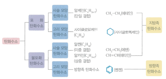 - 지방족 탄회수소 : 탄화수소 중 사슬 모양 탄회수소와 고리 모양 탄화수소는 ,