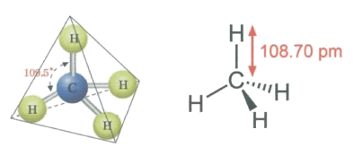 가장 간단한 탄소 화합물로 1개의 탄소 원자에 수소 원자 4개가 결합된 정사면체 구조로 탄소 원자와 수소 원자의 결합각은 109.50