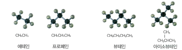 - 사슬 모양 탄화수소 : 구조 중에 고리가 없고 구성 원자들이 사슬 모양으로 결합하고 있는 화합물