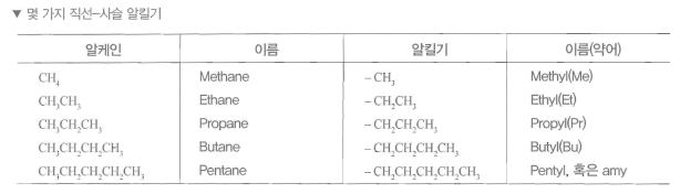 - 주사슬에 붙은 집단을 치환기 (substituents) 라 하고, 포화 탄화수소의 치환기는 알킬기 (alkyl group)라 한다.