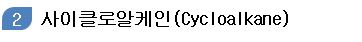 - 여러 개의 탄소 원자가 고리처럼 결합해 있고 단일 결합으로 이루어진 포화 탄화수소이며, 일반식은 CnH2n