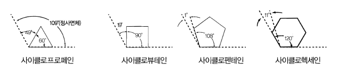 - 사이클로펜테인은 오각형의 결합각(108˚) 이 사면체의 결합각과 가장 유사하여 거의 평면 구조를 가지며 안정적