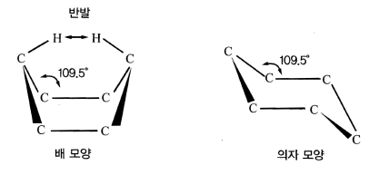 - 사이클로헥세인은 109.5˚와 비교하여 평면육각형일때의 결합각(120˚)이 다르기 때문에 평면 고리가 이를 피하기 위하여 휘어져서 평면 구조에서 벗어남