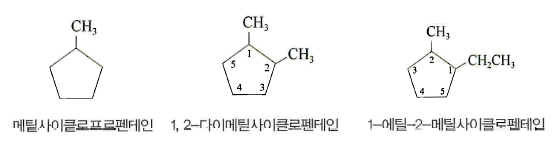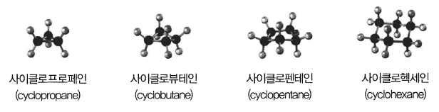- 탄소가 3개인 것을 사이클로프로페인(cyclopropane), 4개인 것을 사이클로뷰태인(cyclobutane), 5개인 것을 사이클로펜테인 (cyclopentane), 6개인 것을 사이클로헥세인 (cyclohexane)