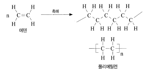 - 중합 반응 : 작은 분자가 연속적으로 반응하여 반복된 결합에 의해 큰 분자를 이루는 것을 중합, 이중 결합을 가지고 있는 화합물이 첨가 반응에 의해 중합되는 것을 첨가 중합, 에텐은 첨가 중합에 의해 폴리에틸렌 생성