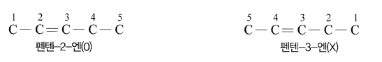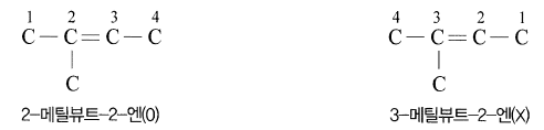 - 2개 이상의 다중 결합이 있을 때에는 첫 번째 다중 결합의 탄소 원자가 작은 번호가 되도록