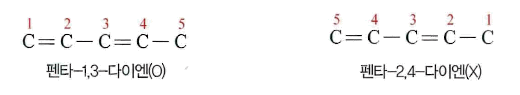 - 둘 이상의 이중 결합이 았으면 그 위치를 변호로 지정하고 어미에 diene, -triene 등으로 명명