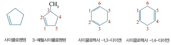 - 3- methylcyclopentene : 이중 결합에서 변호를 시작하되 이중 결합이 포함되게 한다.