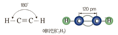- 삼중 결합을 하는 탄소 탄소 원자와 탄소에 결합된 두 원지는 동일한 직선상에 존재