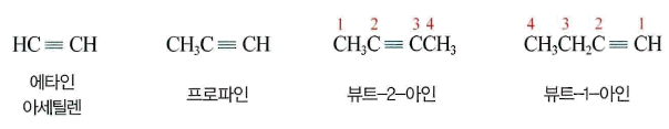- 알카인 중 탄소가 2개인 것을 에테인 (ethyne, 관용명: acetylene), 3개 인 것을 프로파인(propyne), 4개인 것을 뷰타인(butyne), 5개인 것을 펜타인(pentyne)