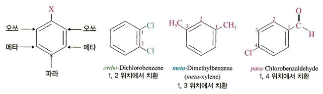 - 2치환체 : 벤젠의 2 치환체 는 치환된 위치에 따라 오쏘 (ortho-) , 메타 (meta- ), .파라(para-)라는 접두어를 사용