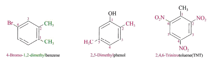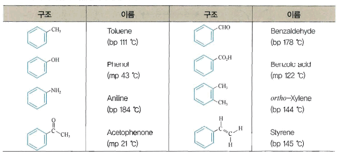 - 관용명 : 방향족 화합물은 명명법이 체계화되기 이전에 널리 사용되었기 때문에 관용명과 IUPAC명이 함께 사용