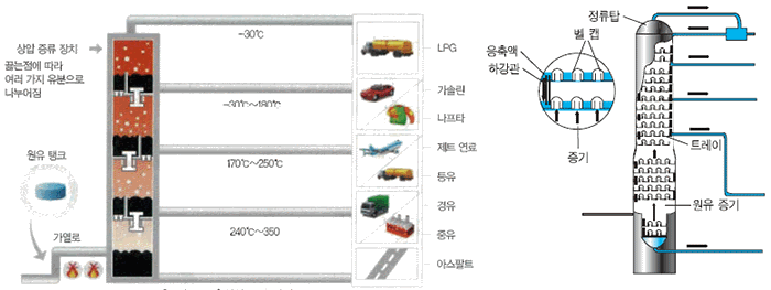 - 원유는 그대로 연료나 화학제품으로 시용할 수 없다. 따라서 원유를 끓는점에 따라 분리하는 조작인 증류가 필요