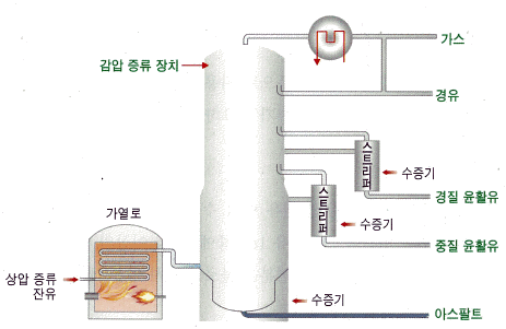 - 증류탑의 상단에서는 끓는점이 낮은 액화 석유 가스가 나오고 하단에서는 기화되지 않은 찌꺼기유가 나오는데, 이것은 감압 증류탑으로 간다.