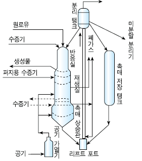 - 공정 중에 촉매 표변에는 탄소가 많이 부착되어 촉매의 활성이 떨어지기 때문에, 사용된 촉매를 재생탑에 옮겨 탄소분을 연소하여 재활용
