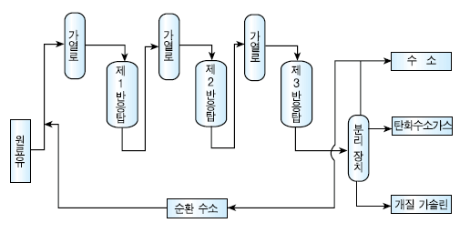 - 상압 증류로 분류된 중질, 경질 가솔린 유분을 고온 고압을 처리하여 열분해와 동시에 화학적 구조를 변화시켜 옥탄가가 높은 양질의 가솔린을 만드는 방법
