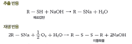 - 전형적인 메록스법은 아래 반응과 같이 수산화 나트륨으로 메르캅탄을 제거하고 분리하여 산소와 반응시켜 수산화나트륨을 회수하여 재사용