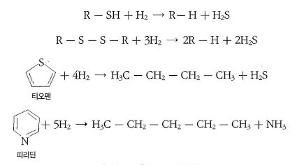 - 유분은 고순도의 수소 기류 중에서 수소와 결합하여 증발되고, 증발된 유분은 니켈(Ni), 텅스텐 (W), 코발트(Co)-몰리브덴 (Mo)과 같은 촉매층을 통과하면서 처리되어 유분 내의 황이 기체상의 황화수소 형태로 제거