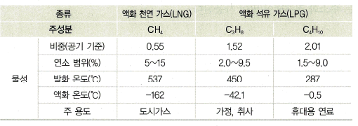 표 액화 천연 가스(LNG)와 액화 석유 가스(LPG)의 물성 비교