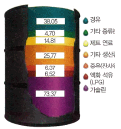 - 원유를 정제하면 LPG 2%, 가솔린 8%, 나프타 12%, 등유와 경유 35%, 중유 38%, 아스팔트와 나머지 잔사유가 5% 정도 생산