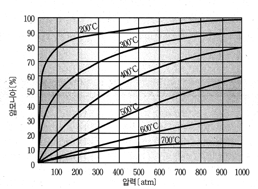 그림 암모니아의 생섬률과 온도 및 압력의 관계