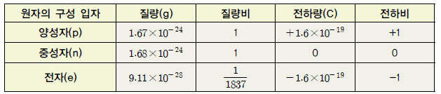 표Ⅰ-1 원자의 구성 입자들의 질량비와 전하