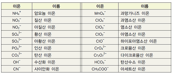 몇 개의 원자가 결합하여 하나의 입자처럼 행동하는 이온을 다원자 이온이라고 한다. 표 I-3은 여러가지 다원자 이온을 나타낸 것이다.