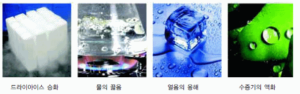 예 - 상태 변화(승화, 응고, 액화, 기화, 융해), 용해, 열팽창, 확산