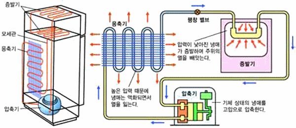 그림 Ⅲ-2 냉장고 원리 : 냉매의 상태가 변할 때(기체⇄액체)의 에너지 출입을 이용