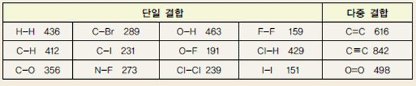 다음 표준 상태의 평균 결합 엔탈피를 보고, 반응 엔탈피를 탐구해 보자.
