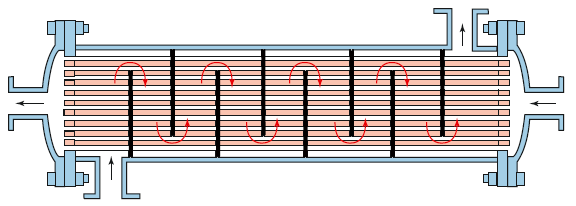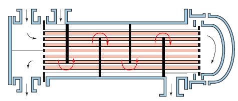 - 다관식 열교환기에서는 열전달을 좋게 하기 위하여 관 배열 및 내부에 방해판을 설치하거나 열팽창에 대비하여 유동 두 구조를 설치