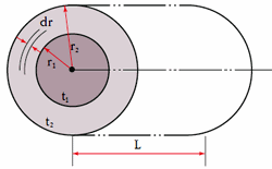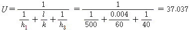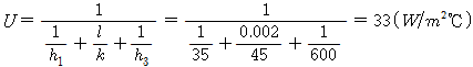 물에 의해 원관 내를 흐르는 공기를 냉각하는 공기 냉각기가 있다. 이 냉각기는 안지름이 50mm, 두께가 2mm인 강관이다. 원관 안쪽 공기측의 경막 계수가 35W/m2·℃이고, 원관 밖의 물측 경막 계수는 600W/m․2℃이며, 강관의 열전도도는 45W/m2·℃이다. 총괄 열전달 계수를 구하여라.