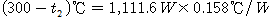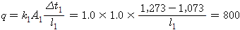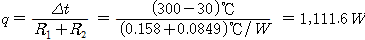 두께가 300mm인 내화 벽돌과 두께 100mm의 석면판으로 된 이중벽이 있다. 벽돌의 안쪽 온도가 1,000℃이고 석면판 바깥쪽 온도가 50℃라면 이 벽 1m2당 손실된 열량을 구하여라.(단, 벽돌과 석면의 열전도도는 0.5W/m·℃, 0.05W/m·℃)