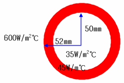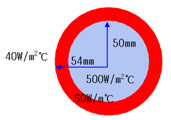 안지름 50mm, 바깥지름 54mm인 원관에 액체가 흐르고 바깥쪽에서 가스로 가열하고 있다. 원관 안쪽 액체 측의 경막 계수가 500W/m2·℃이고 원관 밖의 기체 측의 경막 계수는 40W/m2·℃이며, 강관의 열전도도는 60W/m℃이다. 총괄 열전달 계수를 구하여라.